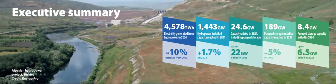 一、总体来看,2024年水电开发继续保持上升态势,积极信号不断显现,尤其是抽水蓄能领域。2024年,全球水电装机容量达1443GW,同比增长1.7%;2024年新增水电装机容量(含抽蓄)24.6GW,高于2023年的22GW;2024年抽蓄装机容量达189GW,同比增长5%;2024年新增抽蓄装机容量8.4GW,高于2023年的6.5GW;尽管拉丁美洲和南非遭遇了严重的干旱情况,2024年全球水力发电量增长约10%,从2023年的4180TWh回升至4578TWh。这一增长体现了水电行业的韧性,但也凸显了由气候引发的变化日益增强,这种变化预计将影响水电逐年的表现。
