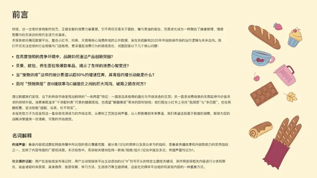 报告基于2023-2025年全网30亿条社交与电商数据,从品类格局、爆品特征、价格带、人群心智、预制争议五大维度,刻画中国烘焙市场“产品+情感”双轮驱动的新周期。核心结论:行业社媒声量三年复合增速51.4%,230元以内中端价格带占九成交易;女性20-30岁为主力,早餐+下午茶占70%场景;“干净配料表”已成底线,口感描述取代风味成为第一转化因子;预制烘焙在效率场景可存活,但“伪装现做”遭集体抵制。