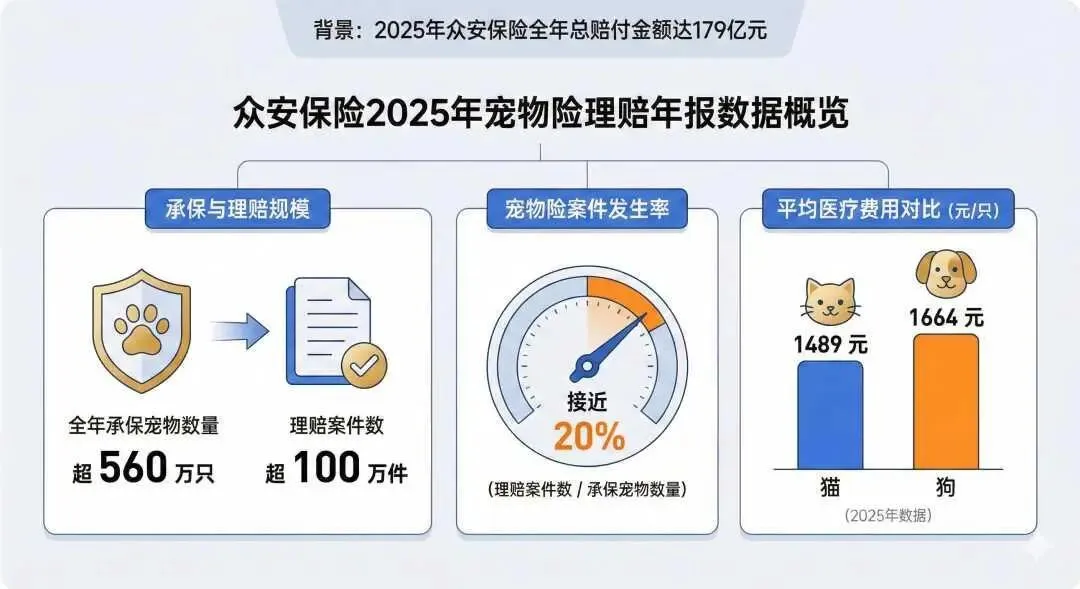 近日众安保险发布了2025年理赔年报。数据显示,众安保险全年总赔付金额达179亿元。其中,宠物险板块的数据尤为引人关注:全年承保宠物数量超560万只,理赔案件数超100万件。