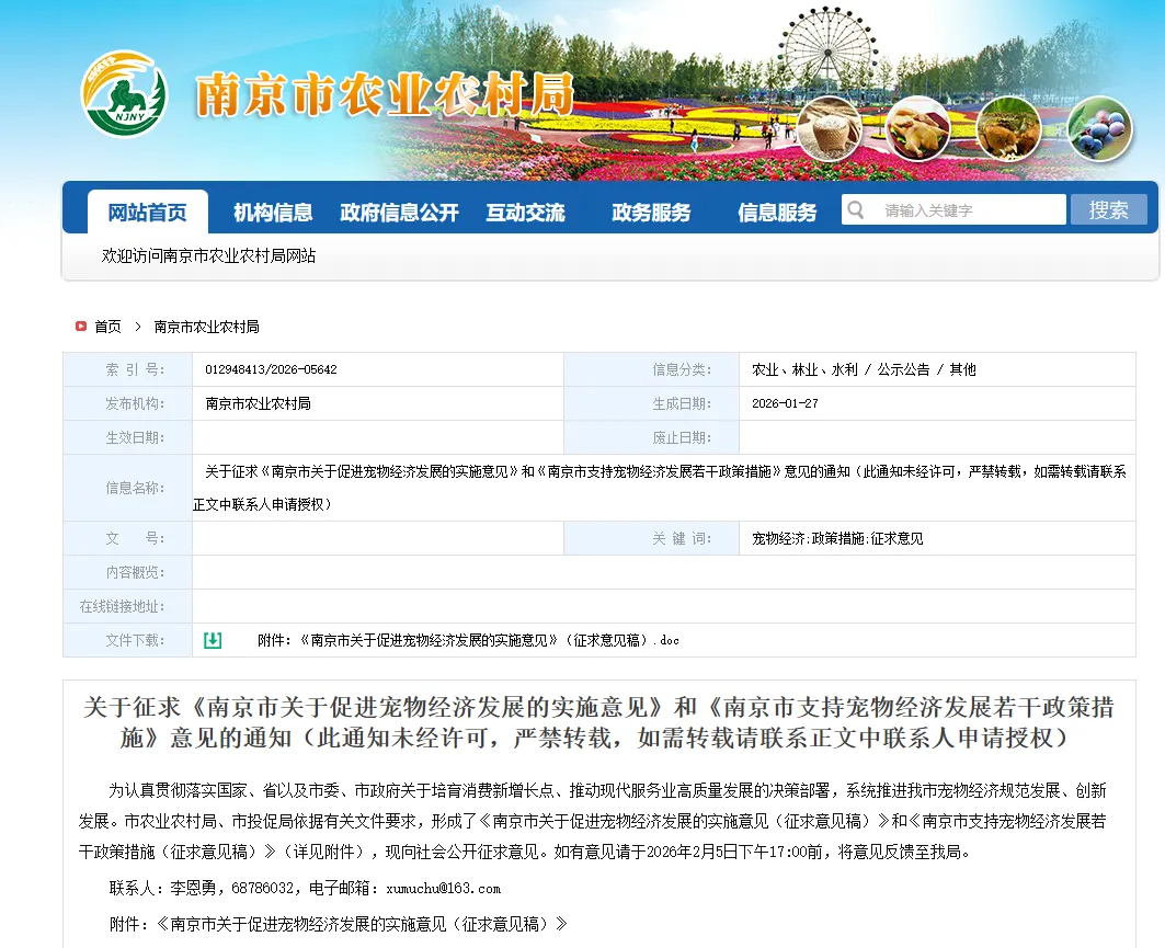 据南京市农业农村局消息,为培育消费新增长点,推动现代服务业高质量发展,南京市农业农村局、市投促局牵头起草了促进宠物经济发展的相关文件,现面向社会公开征求意见。意见反馈截止日期为2026年2月5日下午17:00。