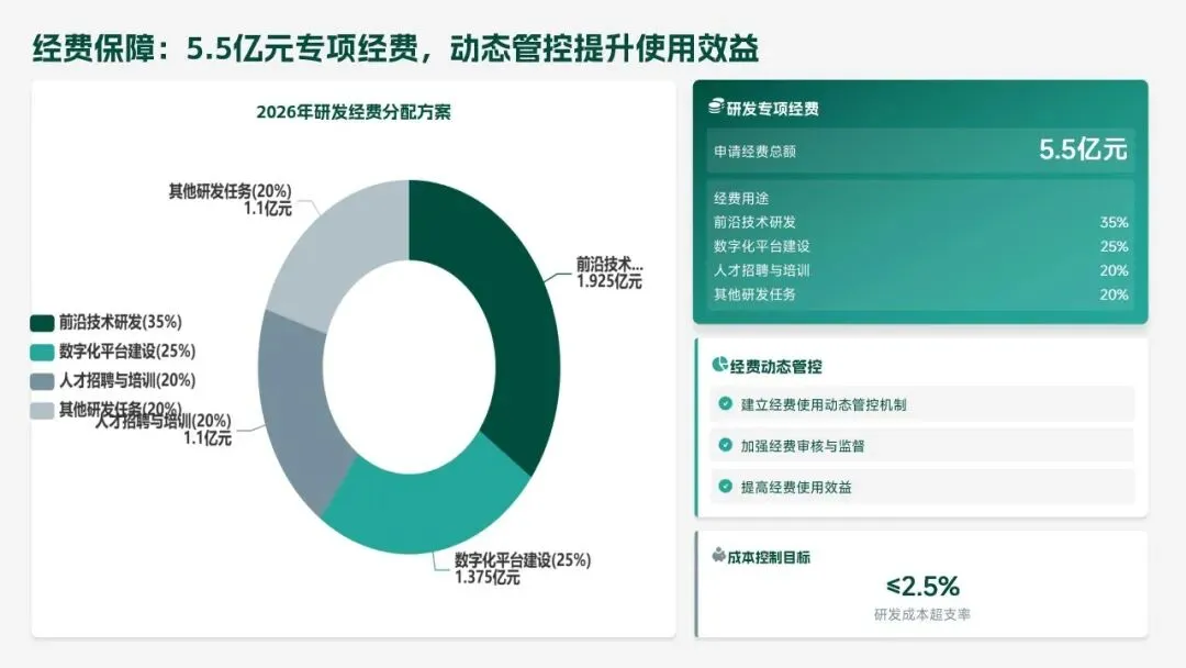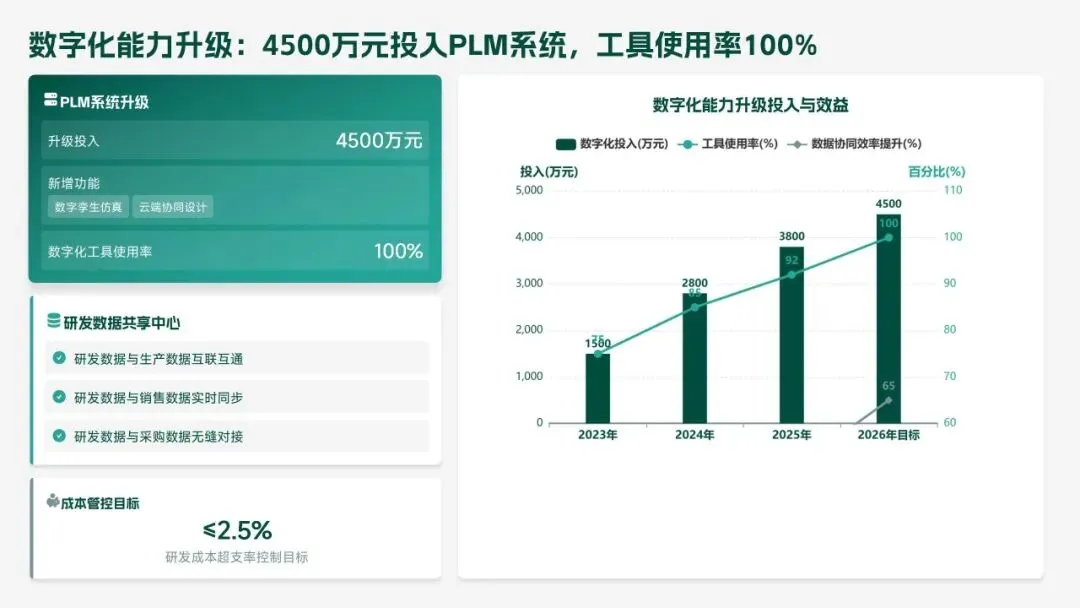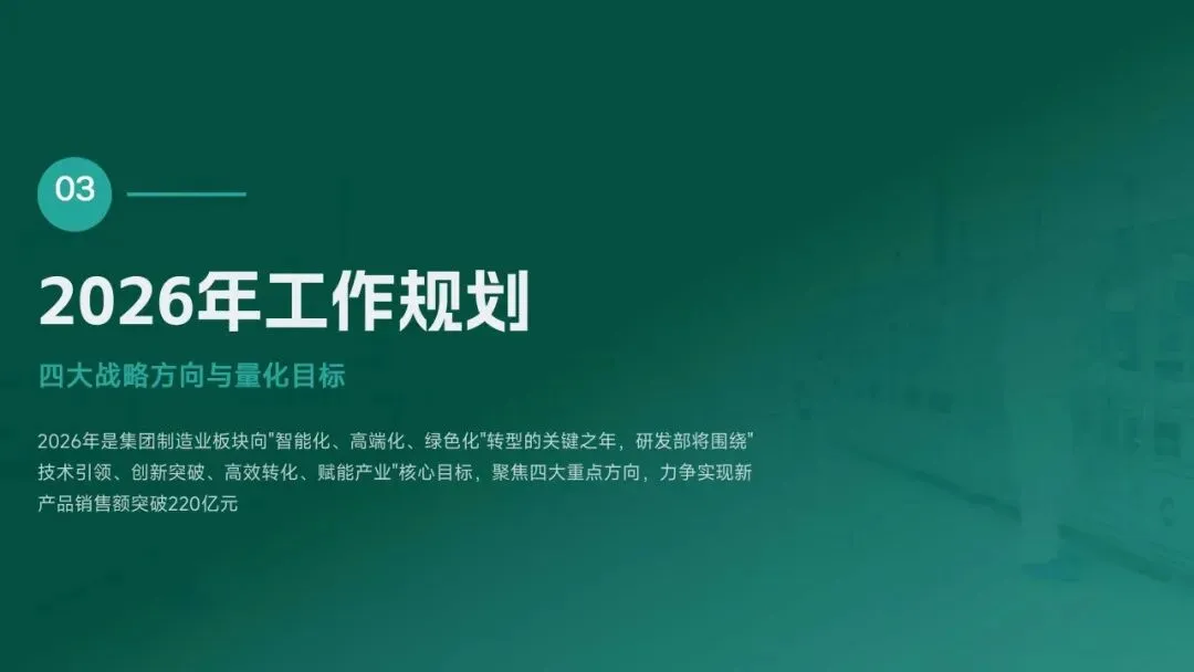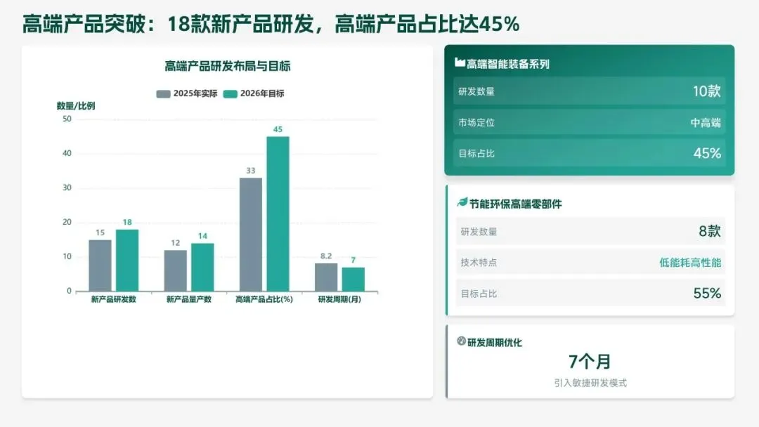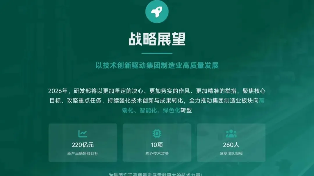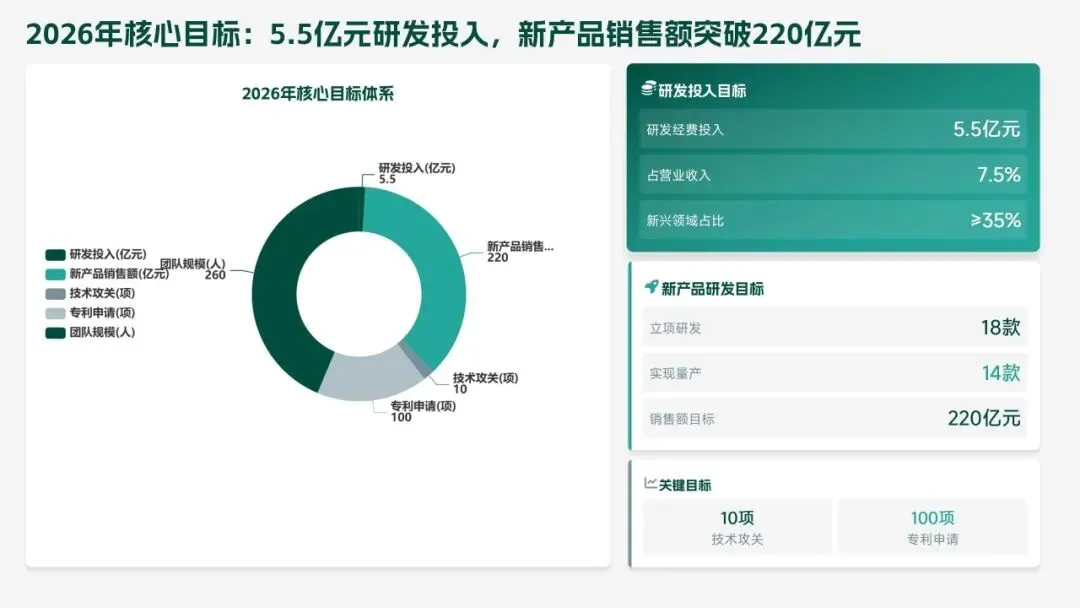 2026 年,研发部聚焦 “智能化、高端化、绿色化” 转型,设定硬核目标:研发投入 5.5 亿元,立项 18 款新产品、量产 14 款,冲击 220 亿元销售额;攻克 10 项核心技术,专利转化效率提升至 80%;团队扩至 260 人,数字化工具使用率 100%。