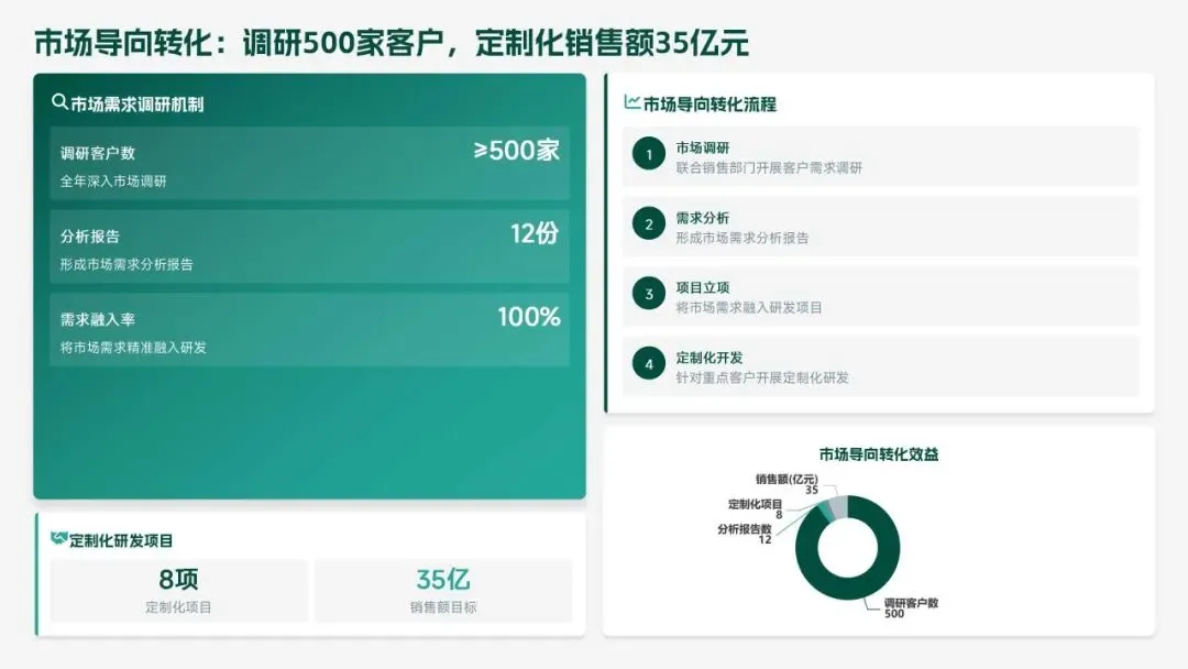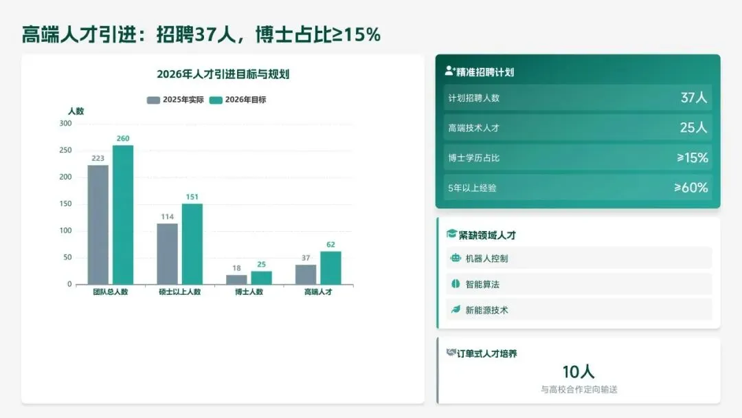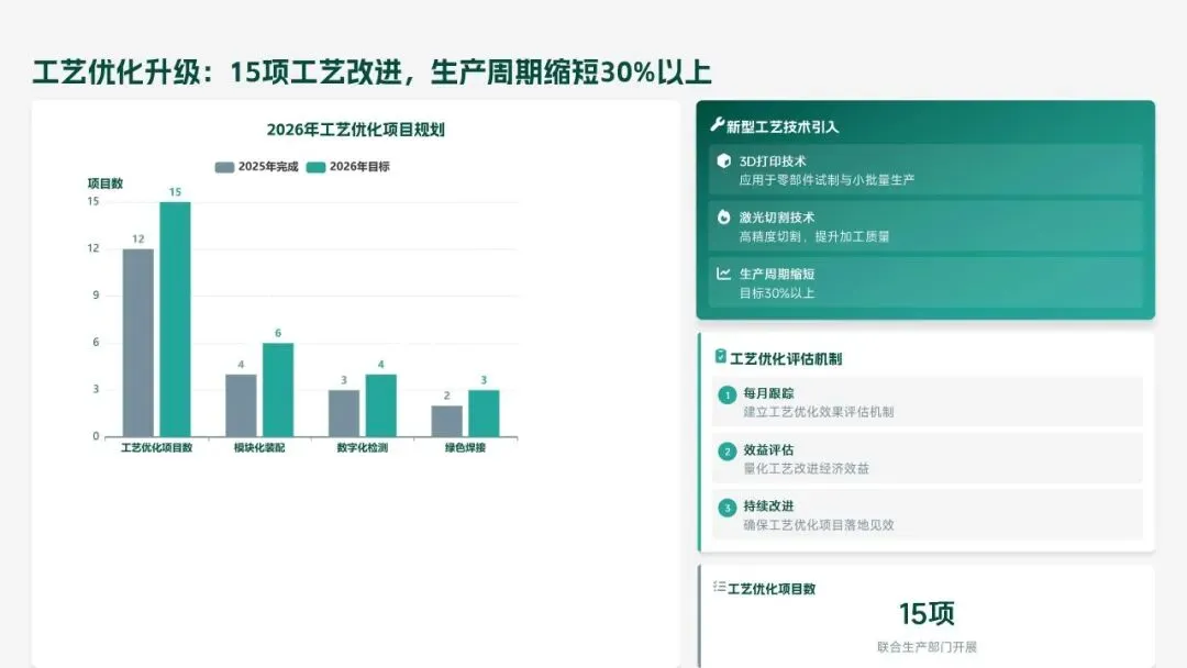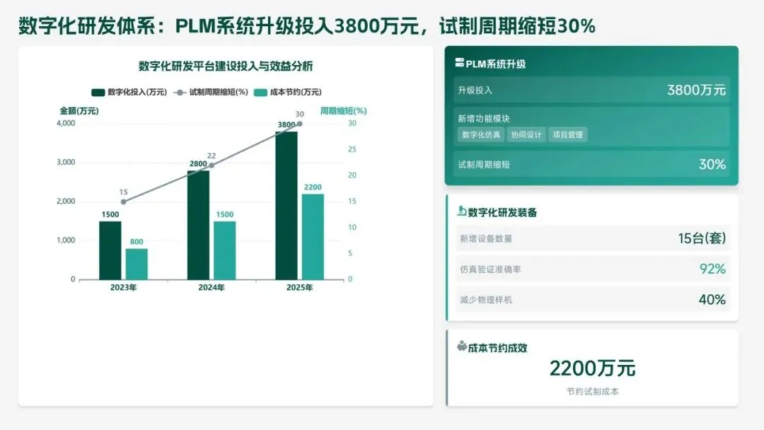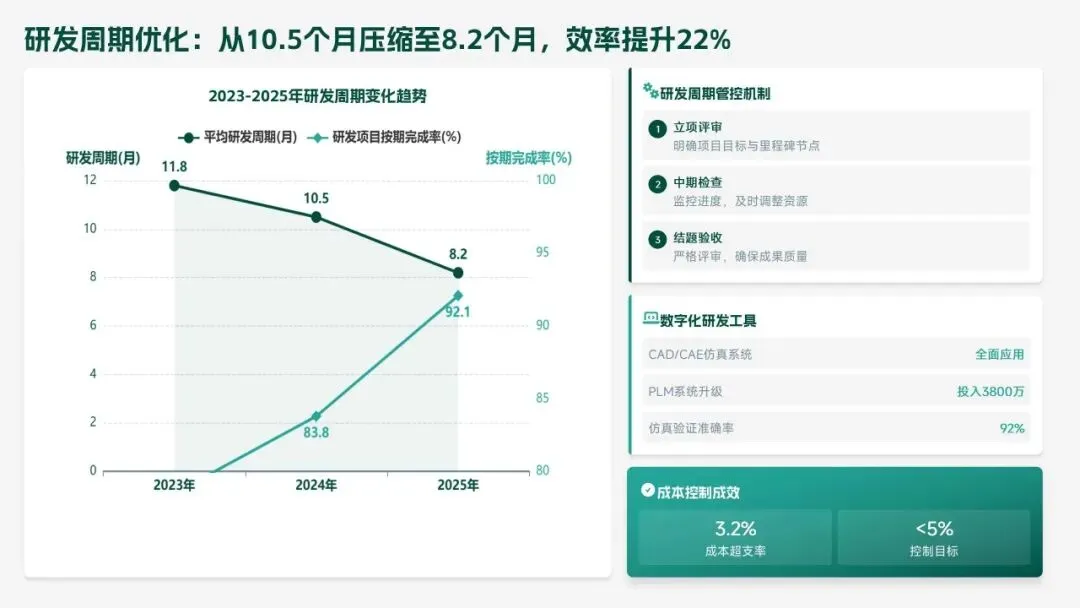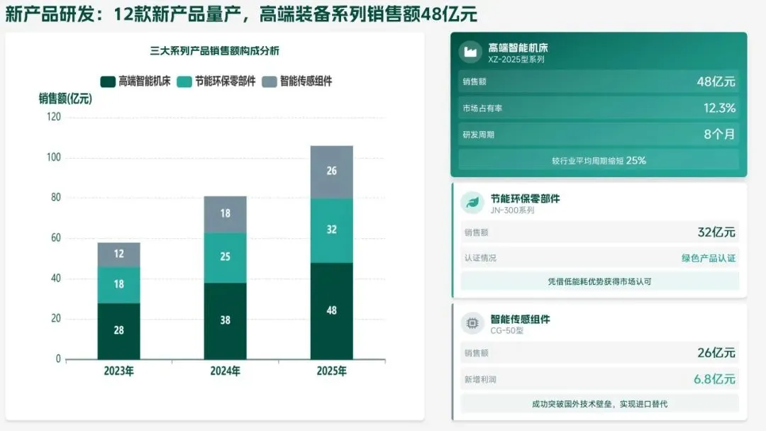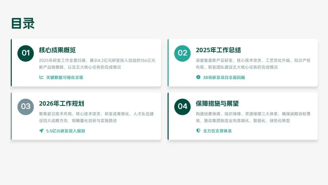 2026 年,研发部聚焦 “智能化、高端化、绿色化” 转型,设定硬核目标:研发投入 5.5 亿元,立项 18 款新产品、量产 14 款,冲击 220 亿元销售额;攻克 10 项核心技术,专利转化效率提升至 80%;团队扩至 260 人,数字化工具使用率 100%。