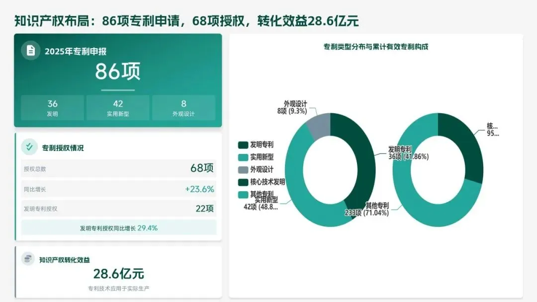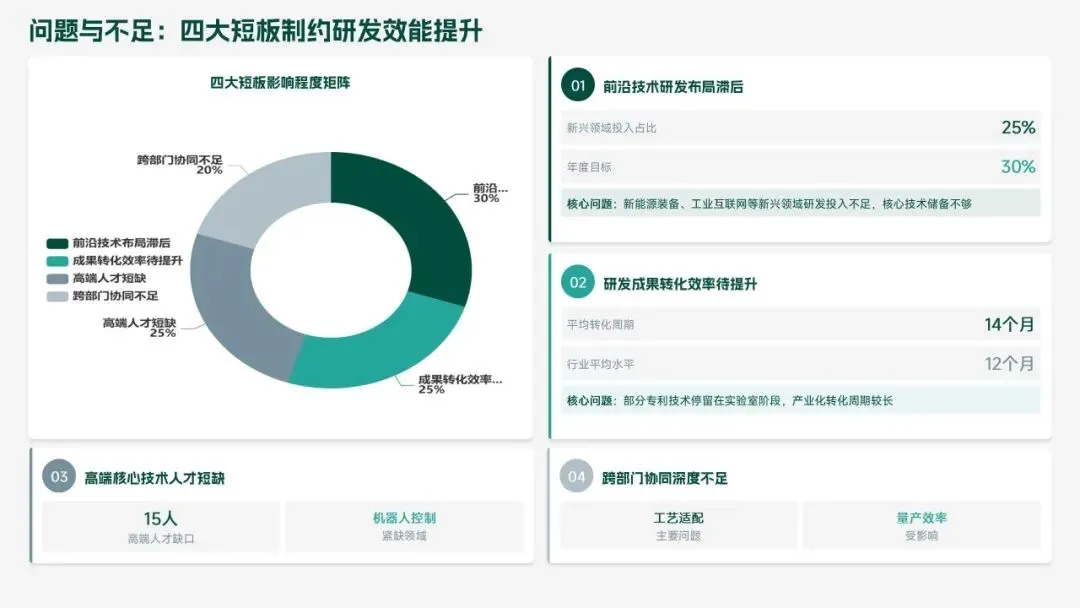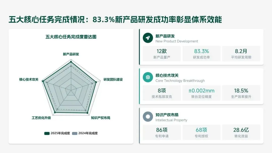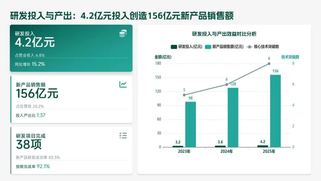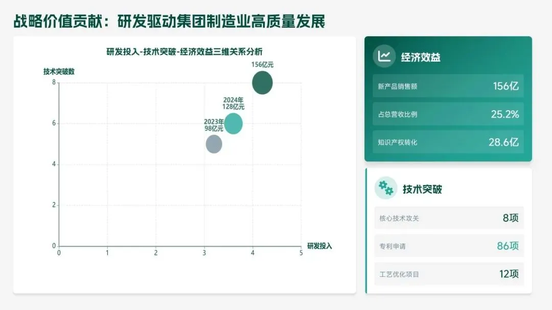 2025 年研发部锚定集团核心战略,交出亮眼答卷:投入研发经费 4.2 亿元(占营收 6.8%),完成 38 项研发项目,成功推出 12 款新产品,实现销售额 156 亿元,攻克 8 项核心技术瓶颈,推动生产效率提升 18.5%、产品不良率下降 22.3%。专利授权 68 项,转化效益达 28.6 亿元,研发团队扩充至 223 人,硕士及以上学历占比提升至 51%,数字化研发能力显著增强。同时,工作仍存短板:前沿领域研发投入不足、成果转化周期偏长、高端人才短缺、跨部门协同待深化。
