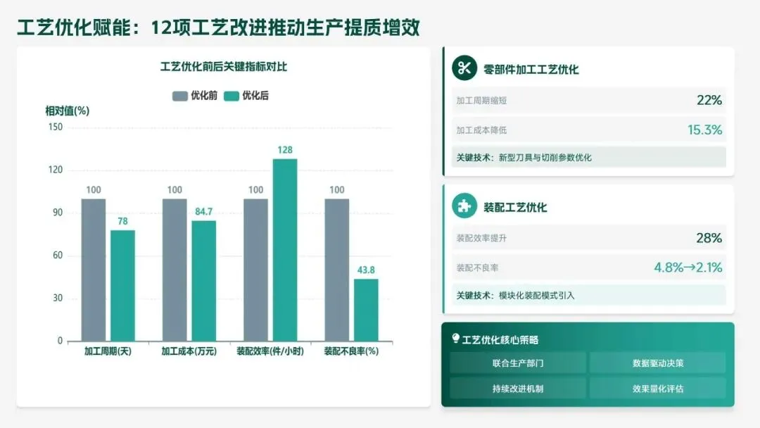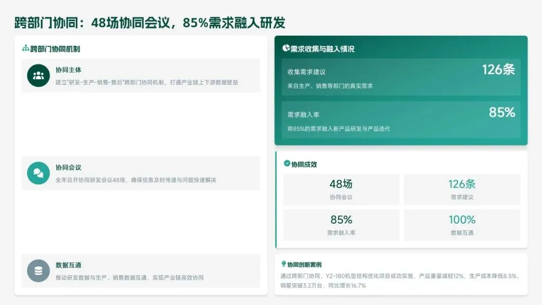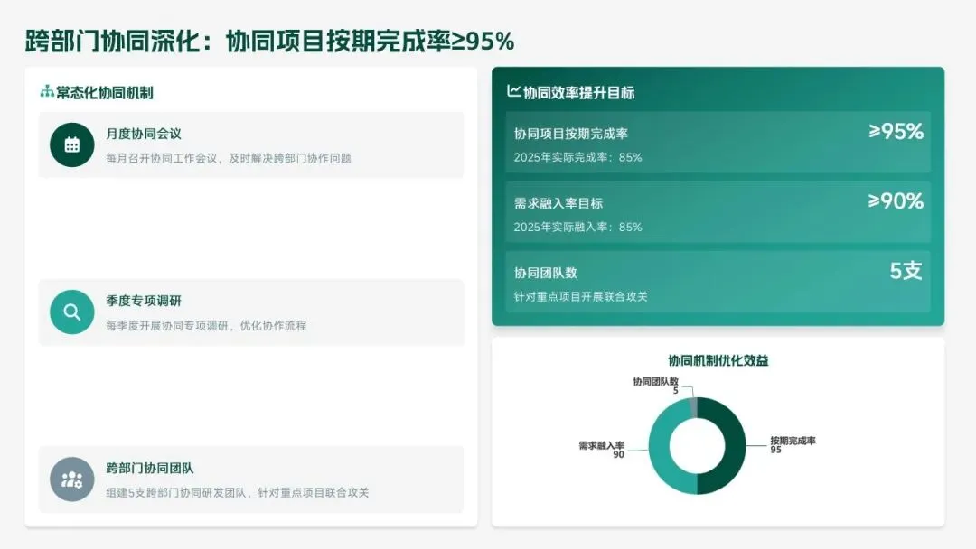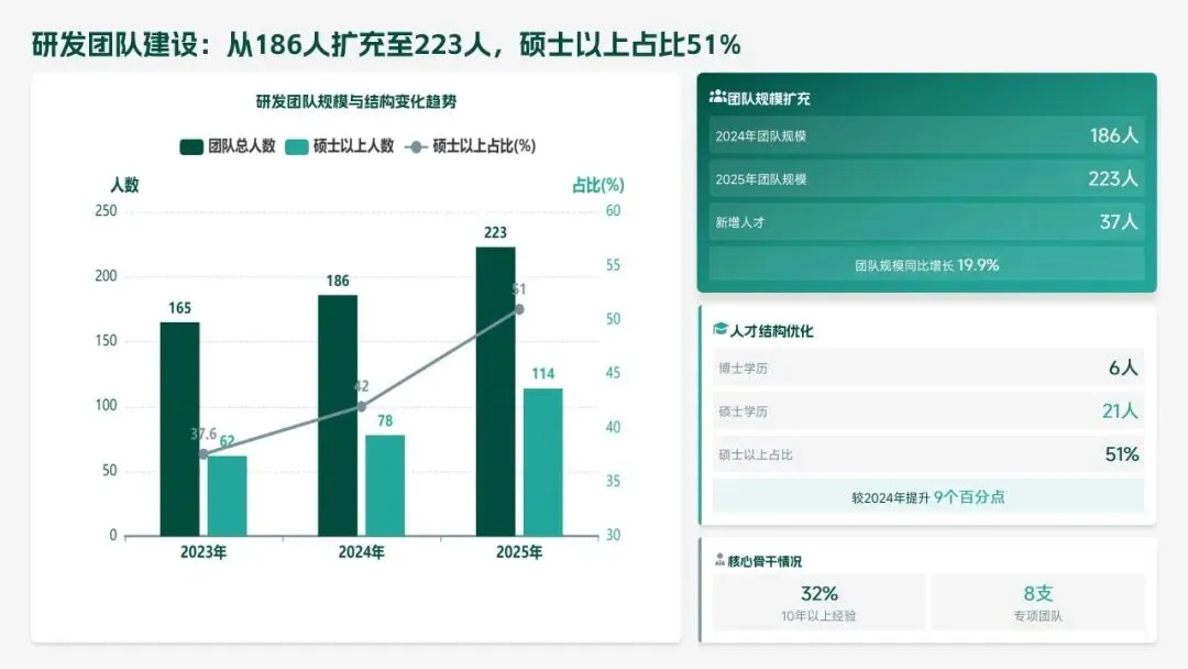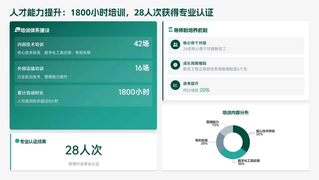 2025 年研发部锚定集团核心战略,交出亮眼答卷:投入研发经费 4.2 亿元(占营收 6.8%),完成 38 项研发项目,成功推出 12 款新产品,实现销售额 156 亿元,攻克 8 项核心技术瓶颈,推动生产效率提升 18.5%、产品不良率下降 22.3%。专利授权 68 项,转化效益达 28.6 亿元,研发团队扩充至 223 人,硕士及以上学历占比提升至 51%,数字化研发能力显著增强。同时,工作仍存短板:前沿领域研发投入不足、成果转化周期偏长、高端人才短缺、跨部门协同待深化。