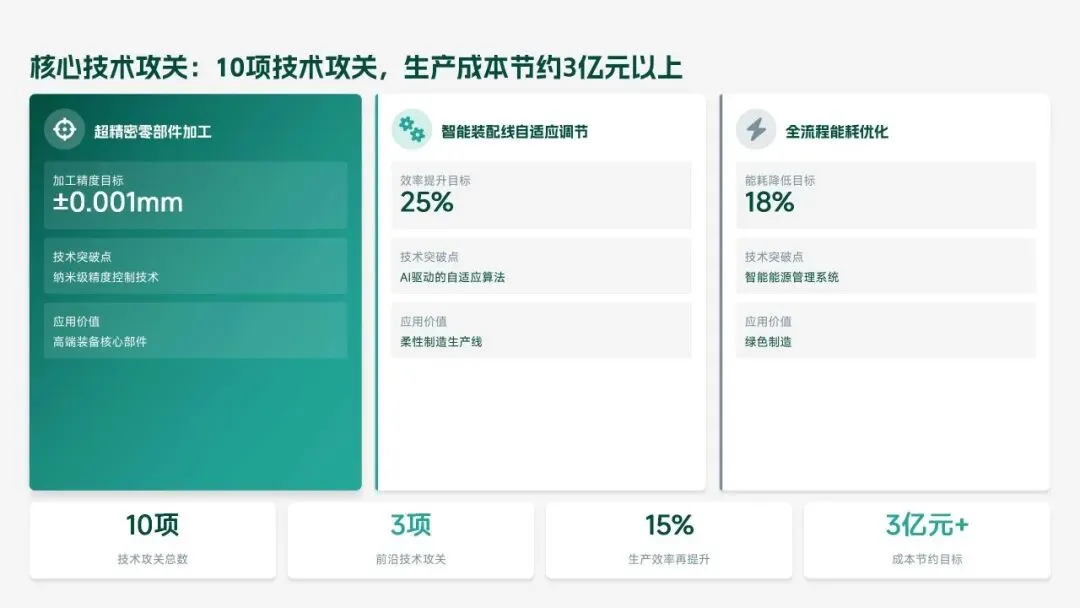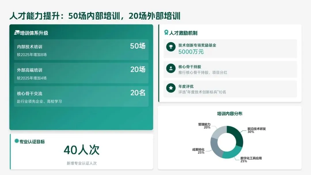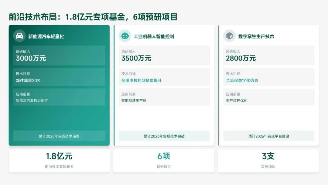 重点攻坚方向:布局新能源装备、工业互联网等前沿赛道,设立 1.8 亿元专项基金;深化超精密加工、智能装配等技术攻关,赋能生产提质;搭建三级转化体系,缩短成果产业化周期;升级数字化研发平台,深化跨部门协同;精准引进 25 名高端人才,完善激励机制,全力为集团高质量发展注入技术动能。