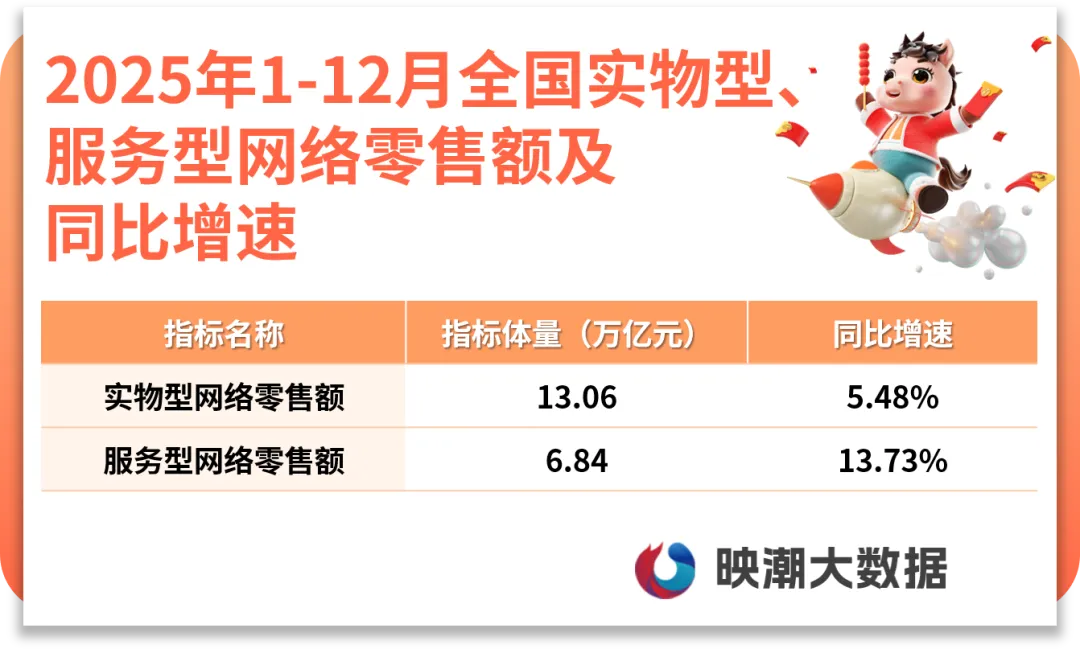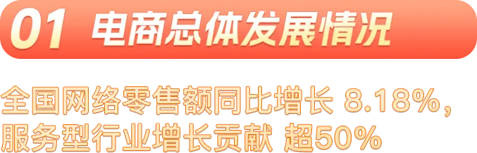 政策红利、技术模式创新、消费需求及供给新趋势、平台竞争等因素共同塑造电商行业结构。网络零售结构中,实物型网络零售稳健发展,全年实现13.06万亿元,同比增长5.48%,占比为65.63%。服务型网络零售加快发展,“营销引流+线上预订+线下体验”成服务消费标配,全年实现6.84万亿元,同比增长13.73%,对整体网络零售额的增长贡献率达54.90%,已超出实物型行业,成为电商增长的中流砥柱。
