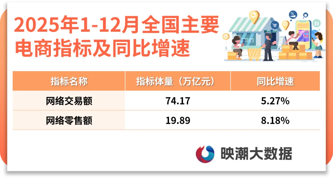 2025年国民经济发展稳中有进,全国积极实施提振消费专项行动,上半年加力扩围消费品以旧换新,下半年政策及时衔接实现全周期覆盖,同时以服务消费为扩大消费新抓手。全年数字消费发展迅猛,线上消费增长动能强劲,显著优于整体消费水平。2025年1-12月,全国网络交易额实现74.17万亿元,同比增长5.27%;网络零售额实现19.89万亿元,同比增长8.18%,明显高于社会消费品零售额、服务零售额增速,电子商务加快向实体经济渗透。