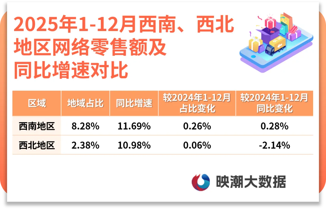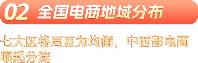 西南、西北增速持续领先,分别为11.69%、10.98%,且西南为七大区中唯一同比增速高于去年的地区。两地区立足优质农牧与丝路文旅产业,均以食品保健、在线餐饮、在线旅游等行业为核心引擎驱动电商增长,网络零售额在全国占比分别提升0.26、0.06个百分点。
