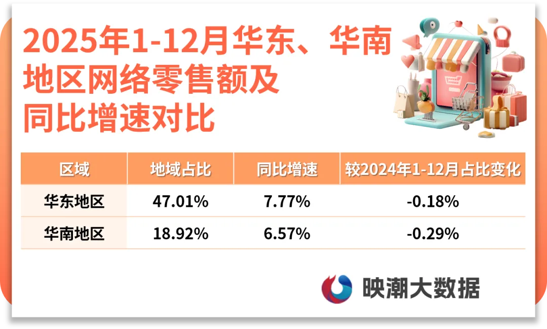 华东地区、华南地区网络零售领先优势显著,但在全国占比略有下滑。华东地区网络零售额在全国占比47.01%,服装鞋包、3C数码、食品保健等主导行业推动电商增长。华南地区网络零售额在全国占比18.92%,较去年同期下滑0.29个百分点,但区域结构性活力释放显著,尤其海南全岛封关后电商消费动能强劲。