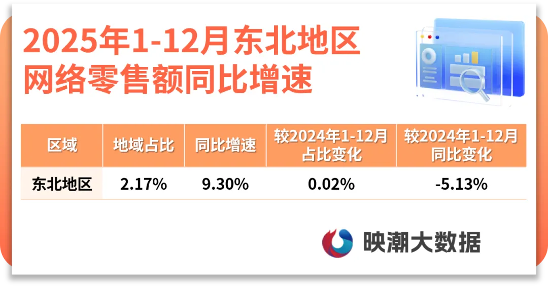 受2024年冰雪经济爆发形成的高基数效应影响,东北地区网络零售额同比增速较上年回落5.13个百分点,但其在全国网络零售市场的占比仍微幅提升。东北的草药、粮油、水产等为代表的农产品线上热销态势持续,此外各地围绕滑雪、滑冰核心业态构建起从装备制造到赛事运营的完整产业链,“冰雪+美食”消费链条有效带动在线餐饮、运动户外两大行业实现协同增长。