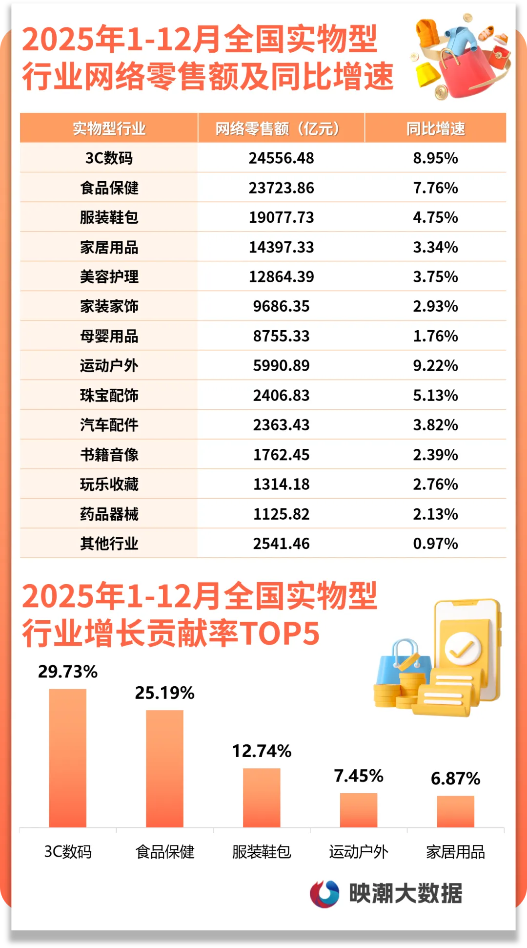 2025年运动户外、3C数码、食品保健网络零售额同比增速分别达9.22%、8.95%、7.76%,位列前三,增长贡献显著。