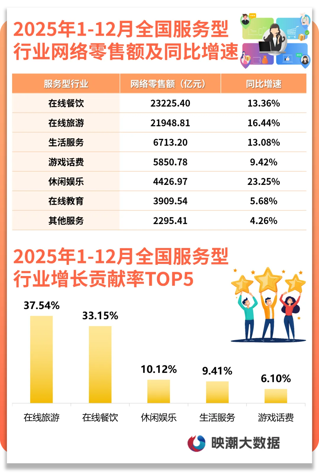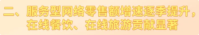 在地域新场景打造、平台新技术赋能、消费者新需求活跃等多重因素推动之下,服务型网络零售额的同比增速从第一季度到第四季度实现逐季提升,第四季度同比增长17.16%,1-12月整体增长13.73%。在线餐饮、在线旅游网络零售额均超2万亿元,排名行业前两位,增长贡献率合计超70%,休闲娱乐同比增速排名行业第一,增势迅猛。