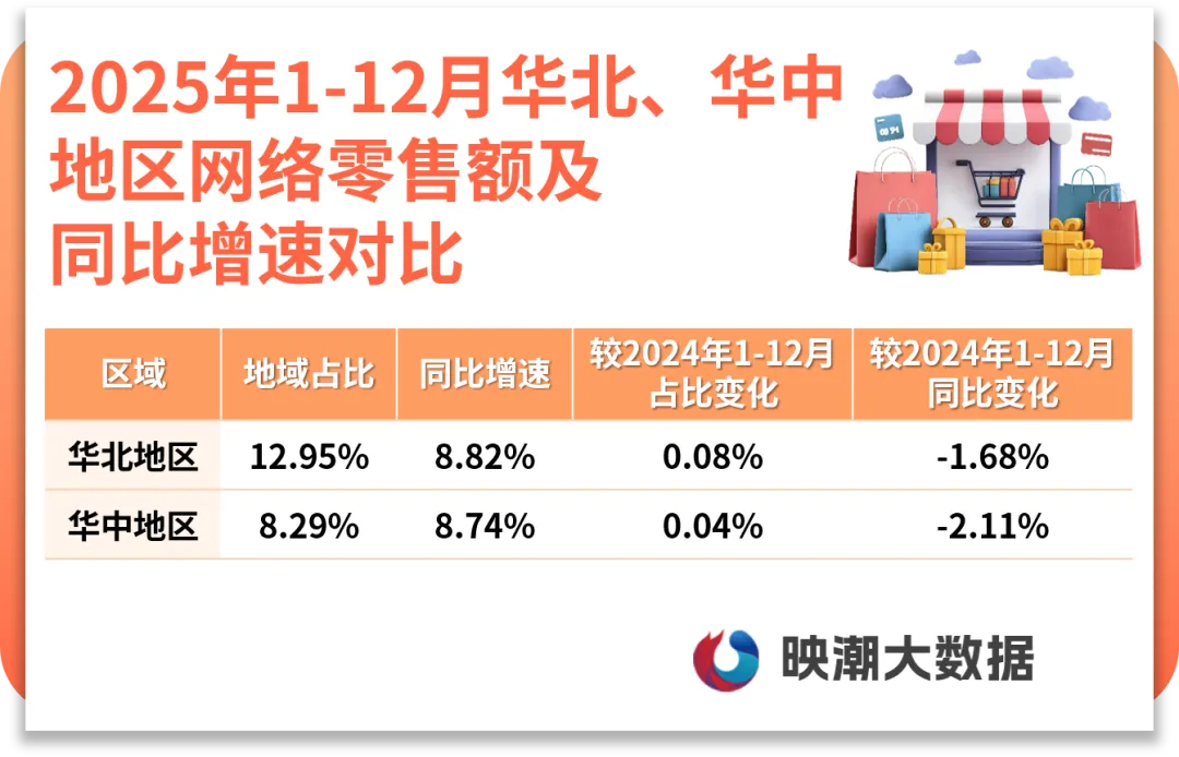 华北、华中稳健增长,网络零售额同比增速分别实现8.82%、8.74%,在全国占比分别提升0.08、0.04个百分点。华北地区的食品保健、运动户外、汽车配件等优势电商行业加快发展,“出版高地”的数字转型、高教资源的云端转化共同带动书籍音像、在线教育等“知识经济”快速增长;华中优势产业集群与电商深度耦合,3C数码、服装鞋包行业占比具备显著优势,珠宝配饰、家居用品增速亮眼。