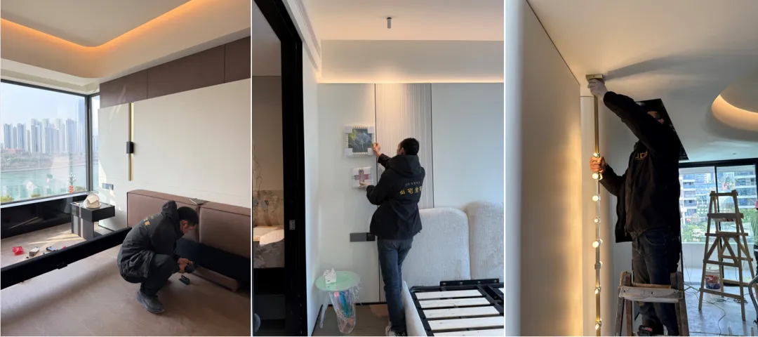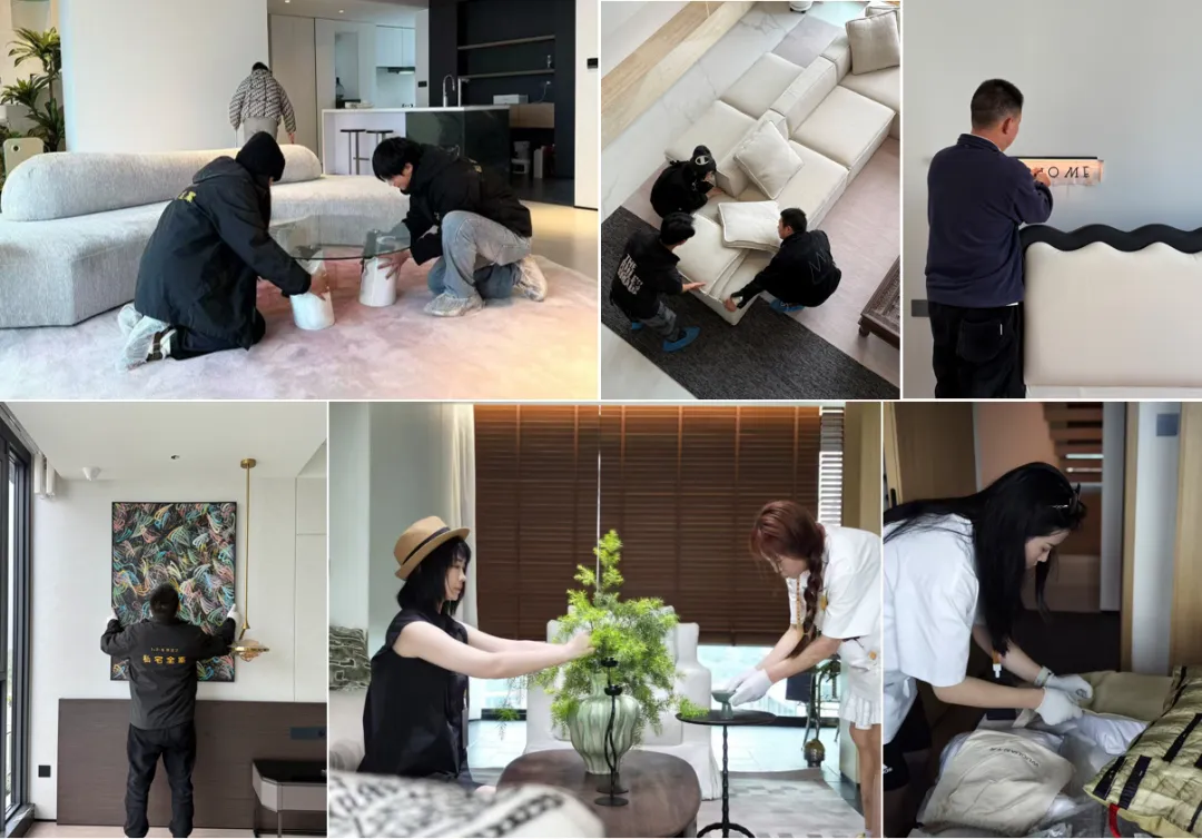 2、摆场落地提前通知业主工作安排。根据方案与图纸,搬运、安装并调整所有软装物品,步骤包括:搬运拆包→灯具、家具安装→挂画、窗帘、地毯铺设→饰品花艺摆放→最终调整(约3-5天,视项目而定)。