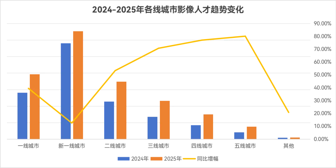 摄影师的地域分布与区域活动热度高度重合,一线、新一线城市作为传统高热度市场,影像人才规模始终处于高位,成熟的市场生态不仅提供了丰富的实践机会,也让新人能够快速积累专业项目经验;与此同时,三四五线城市的活动场次高速增长,直接带动当地影像人才增幅突破70%,形成“市场吸引人才,人才繁荣市场”的正向循环。