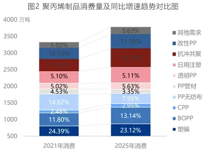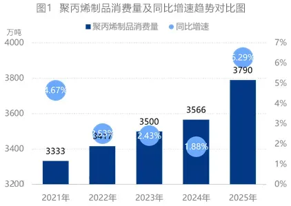 2021-2025年,中国聚丙烯制品消费量从2021年的3332.73万吨增加到2025年的3790.12万吨,同比增速13.72%,2025年成为历年增速最快的一年,主要驱动因为包括宏观行业政策、供应及需求等。