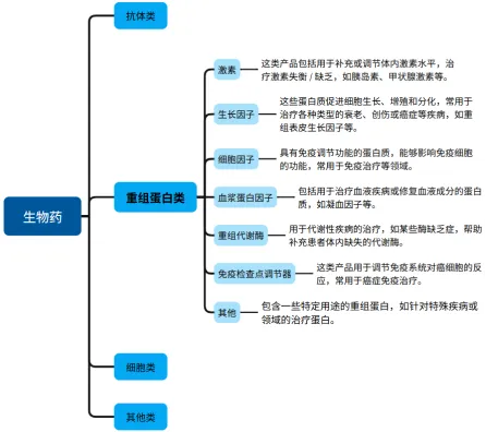 重组蛋白类生物药按功能与结构可分类为激素、生长因子、细胞因子、血浆蛋白因子、重组代谢酶、免疫检查点调节器及其他,其应用覆盖治疗、预防、诊断等场景。