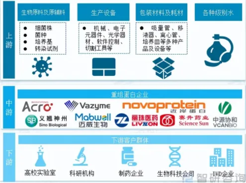 重组蛋白的产业链上游为原材料及设备,主要包括生物原材料及原辅料、生产设备、包装材料及耗材、各种级别水等。