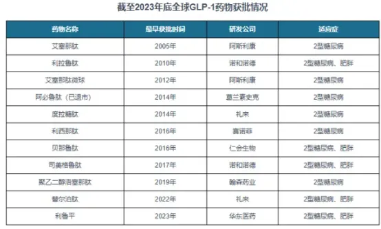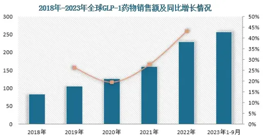 同时,凭借着改善β细胞功能、降低血压、增加饱腹感、减重等多重优势,GLP-1药物在全球市场中备受欢迎。近年来,在市场需求的推动下,其销售额快速增长,2022年达到230.25亿美元,同比增长43.19%。2023年1-9月,其销售额突破250亿美元。随着全球糖尿病、肥胖人数上升和GLP-1药物肥胖适应症陆续获批,将给GLP-1药物市场带来巨大增量空间。根据预测,到2031年,全球GLP-1药物销售规模有望突破1600亿美元。