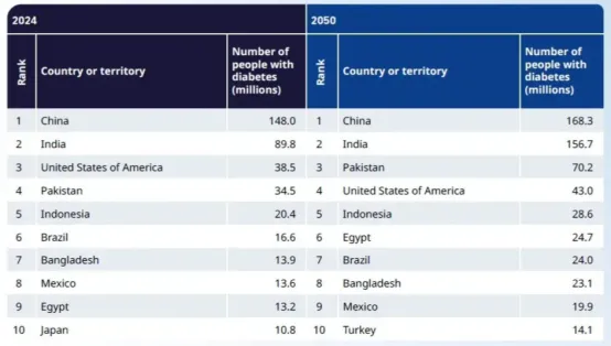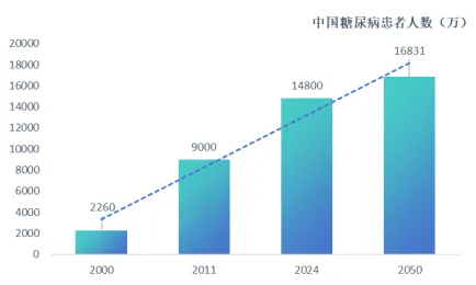 数据显示,中国2000年糖尿病患者为2260万,2011年糖尿病患者为9000万,患病率为9%,2024年糖尿病患者为1.48亿,患病率为12%,死亡比例为10.6%,预计到2050年,糖尿病患者将达到1.683亿,患病率将上升至14%。