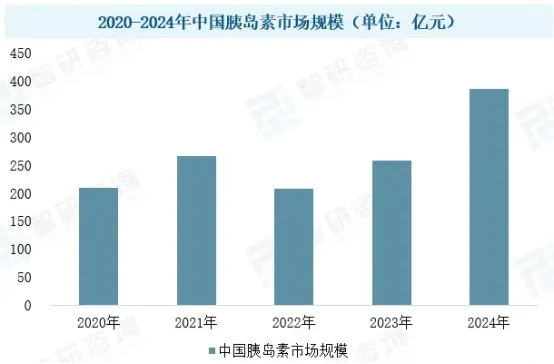 中国胰岛素市场规模从2020年的208.9亿元增长至2024年的385亿元,年复合增长率达16.7%。其中,2024年重组人胰岛素行业市场规模约123亿元,同比增长44%,占整体胰岛素市场的比重稳定在32%左右。这一增长主要得益于两方面:一是集采政策推动均价下降(2024年预混30R剂型单价较2020年降幅超40%),显著提升基层渗透率;二是企业通过剂型创新(如50预混制剂)满足个性化治疗需求,拓展市场份额。随着县域医共体建设深化和糖尿病分级诊疗推进,重组人胰岛素有望继续以“高性价比+广覆盖”策略巩固中低端市场,同时通过出口拓展开辟新增量空间。