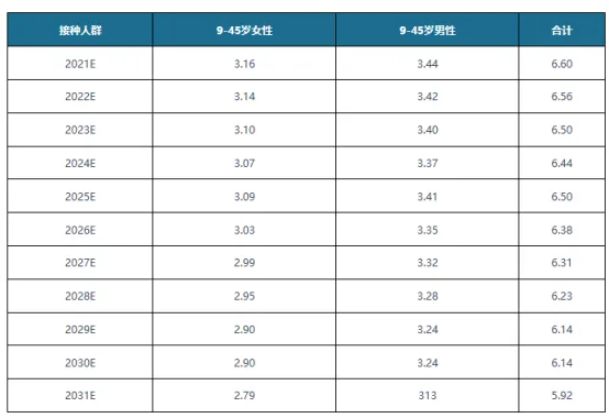 预计中国2030年9-45岁女性数量约2.9亿人,若接种率提升至50%(保守估计)。基础需求为2.9亿×50%×2针(9−14岁)/3针(15−45岁)×平均单价(国产二价300元+国产九价499元,加权平均月400元)≈480亿元。
