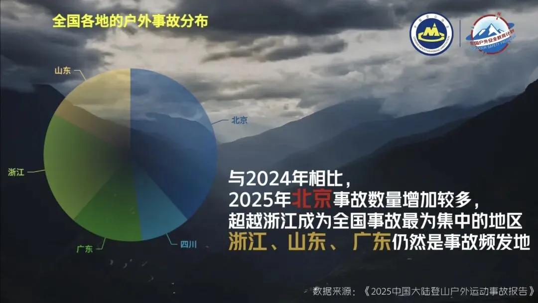 2025年,北京事故数量居榜首,浙江、山东、广东仍是事故频发地,四川、广东死亡人数较多,主要事故项目为高山探险和穿越。
