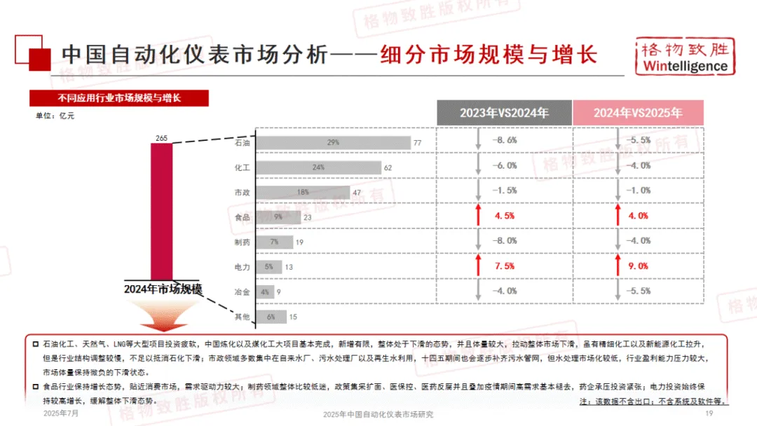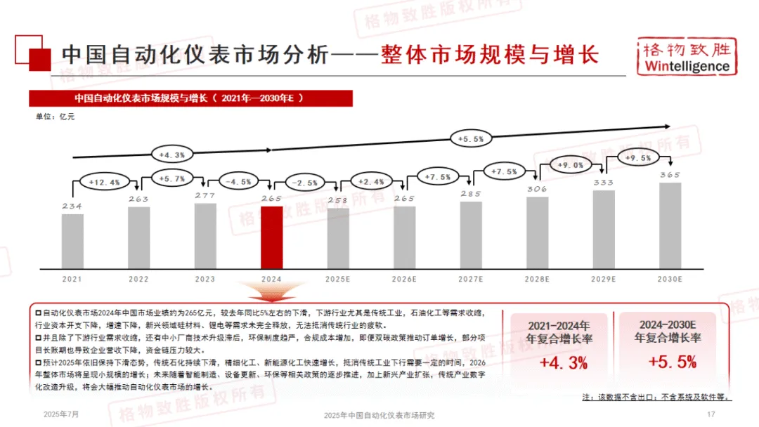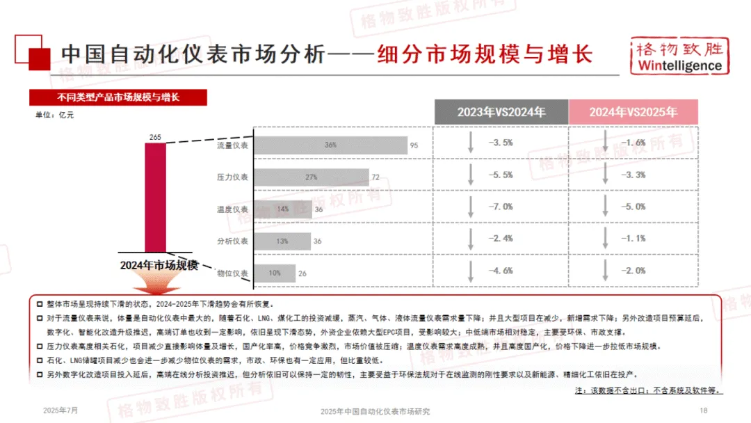 市场规模上,2024年中国自动化仪表市场约265亿元,同比下滑约5%,受传统行业需求收缩等影响。2025年预计仍下滑,2026年有望回升,2024 - 2030年复合增长率约5.5%。细分产品中,流量仪表体量最大但呈下滑态势,压力、温度等仪表也有不同程度波动。应用行业中,石油、化工占比高但下滑,食品、电力等保持增长。区域市场华东占比最大,华中、西南等有增长潜力。