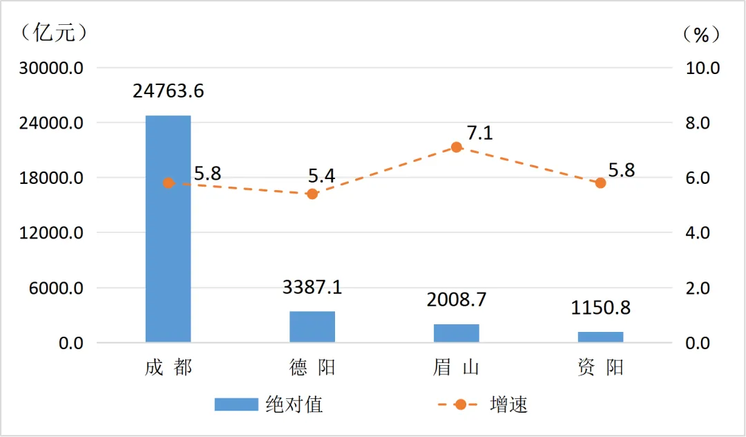 2025年,成都都市圈地区生产总值31310.3亿元,同比增长5.8%,增速高于全省0.3个百分点,经济总量占全省比重为46.3%。其中,成都市地区生产总值24763.6亿元,增长5.8%,占都市圈比重为79.1%;德阳市地区生产总值3387.1亿元,增长5.4%;眉山市地区生产总值2008.7亿元,增长7.1%;资阳市地区生产总值1150.8亿元,增长5.8%。