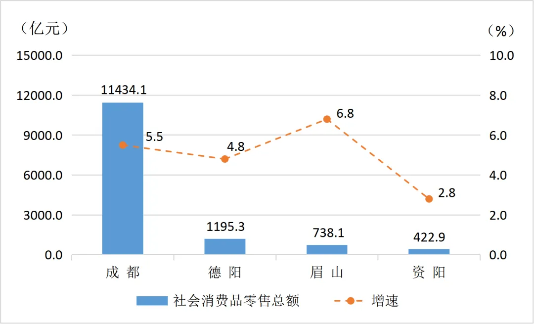 2025年,成都都市圈社会消费品零售总额13790.5亿元,同比增长5.4%,占全省比重为47.3%。其中,成都市社会消费品零售总额11434.1亿元,增长5.5%,占都市圈比重为82.9%;德阳市、眉山市、资阳市社会消费品零售总额分别为1195.3亿元、738.1亿元、422.9亿元,分别增长4.8%、6.8%、2.8%。