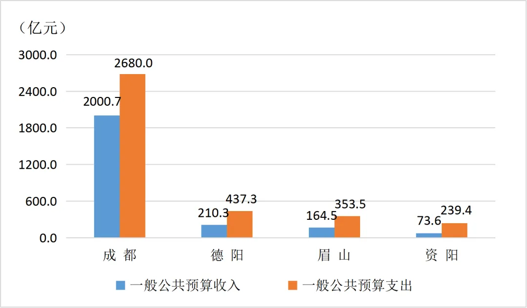 2025年,成都都市圈一般公共预算收入2449.1亿元。其中,成都市一般公共预算收入2000.7亿元,占都市圈比重为81.7%;德阳市、眉山市、资阳市一般公共预算收入分别为210.3亿元、164.5亿元、73.6亿元。