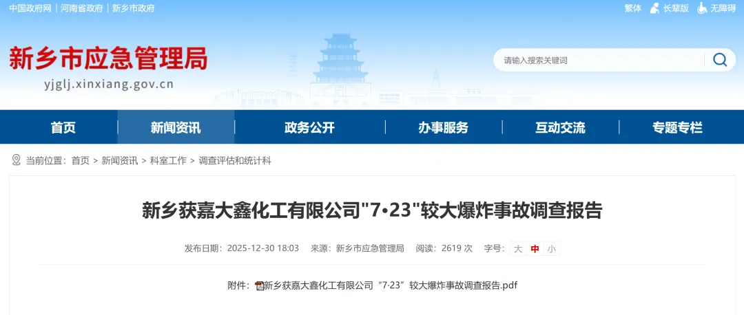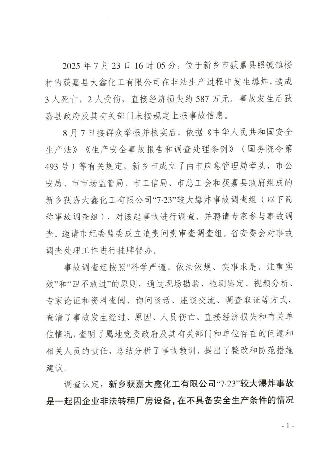 2025年7月23日16时05分,位于河南省新乡市获嘉县照镜镇楼村的获嘉县大鑫化工有限公司在非法生产过程中发生爆炸,造成3人死亡、2人受伤,直接经济损失约587万元。