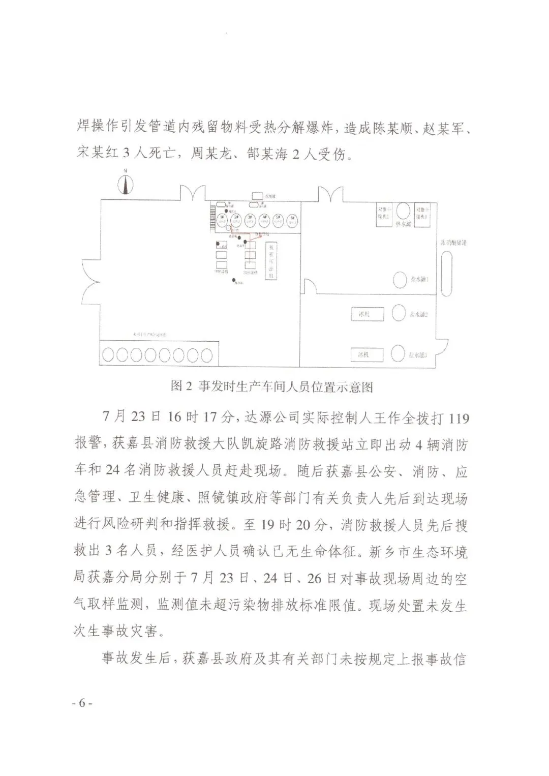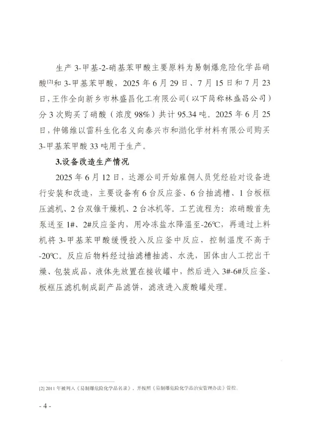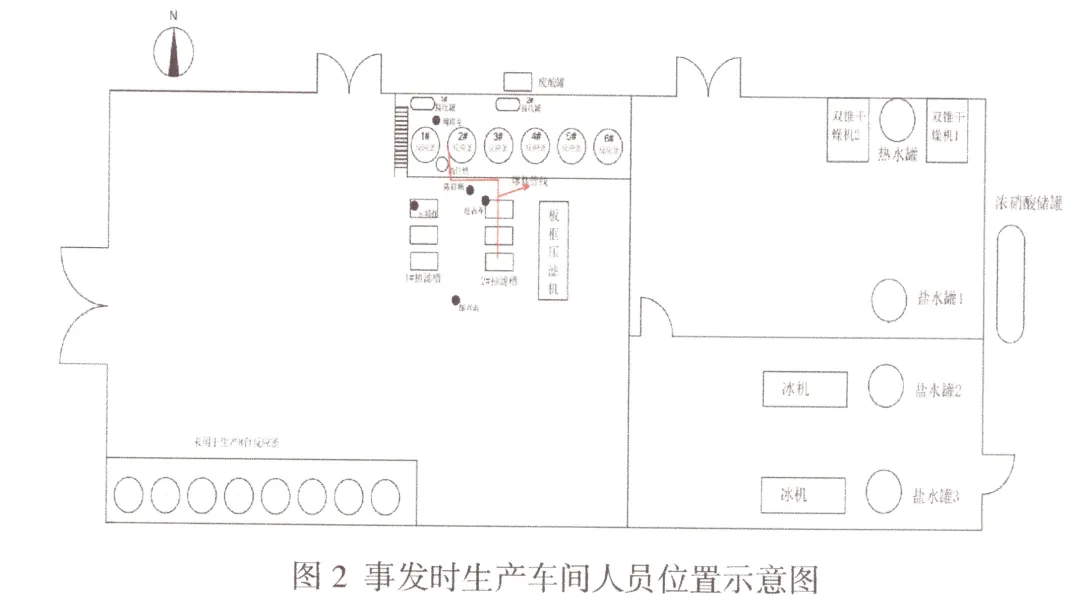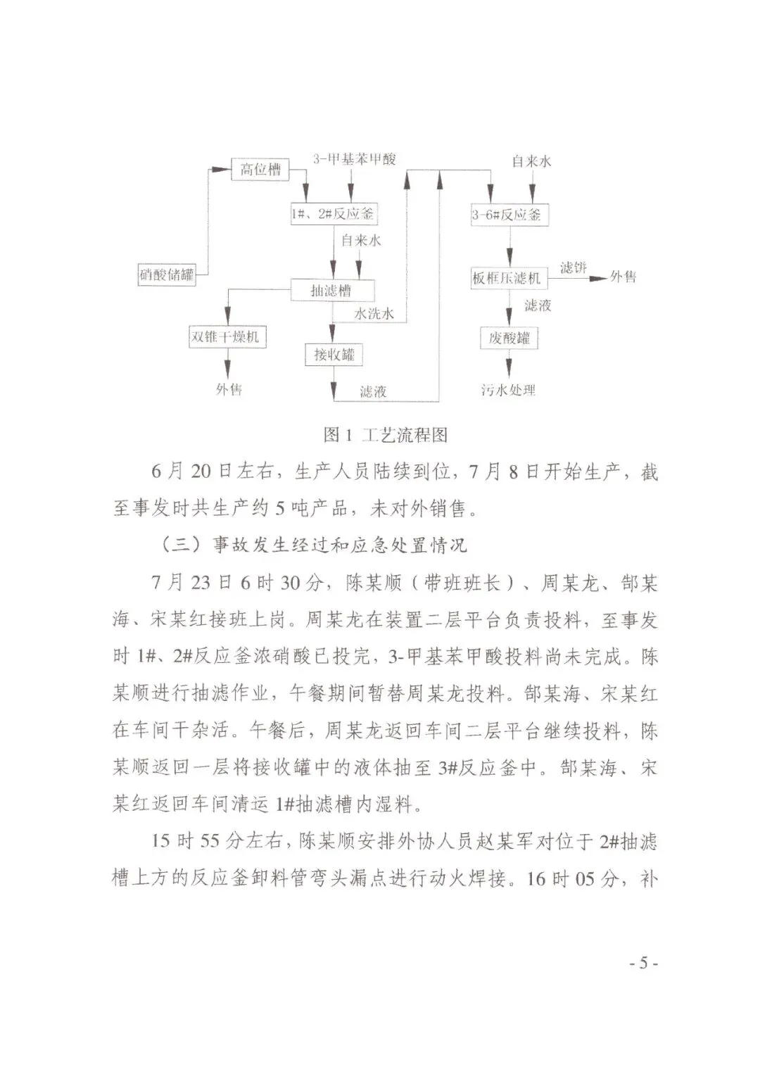 2025年7月23日6时30分,陈某顺 (带班班长)、周某龙、郜某海、宋某红接班上岗。周某龙在装置二层平台负责投料,至事发时1#、2#反应釜浓硝酸已投完,3-甲基苯甲酸投料尚未完成。陈某顺进行抽滤作业,午餐期间暂替周某龙投料。郜某海、宋某红在车间干杂活。午餐后,周某龙返回车间二层平台继续投料,陈某顺返回一层将接收罐中的液体抽至3#反应釜中。 郜某海、宋某红返回车间清运1#抽滤槽内湿料。