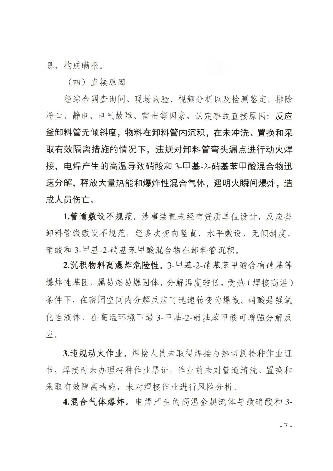 反应釜卸料管无倾斜度,物料在卸料管内沉积,在未冲洗、置换和采取有效隔离措施的情况下,违规对卸料管弯头漏点进行动火焊接,电焊产生的高温导致硝酸和3-甲基-2-硝基苯甲酸混合物迅速分解,释放大量热能和爆炸性混合气体,遇明火瞬间爆炸,造成人员伤亡。