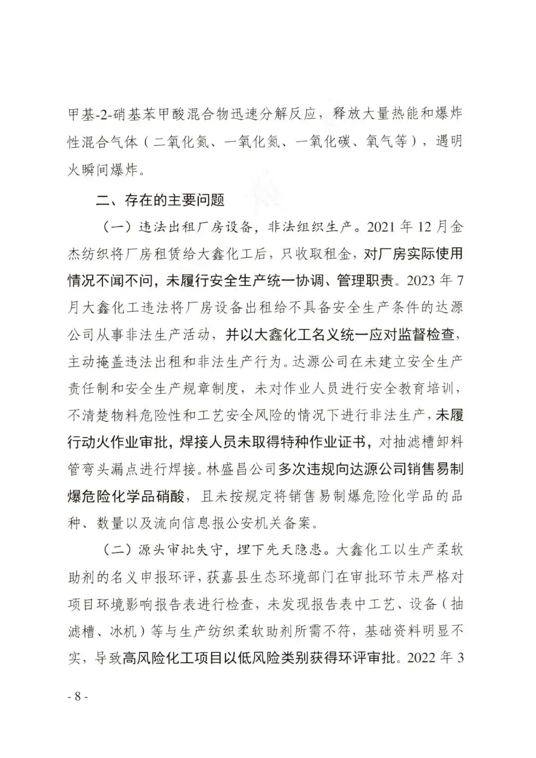 2023年7月大鑫化工违法将厂房设备出租给不具备安全生产条件的达源公司从事非法生产活动,并以大鑫化工名义统一应对监督检查,主动掩盖违法出租和非法生产行为。