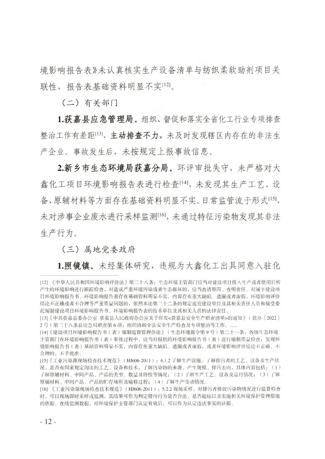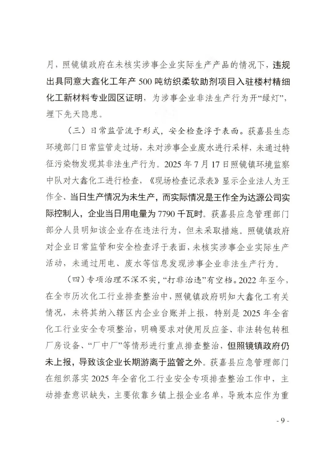 获嘉县生态环境部门日常监管走过场,未对涉事企业废水进行采样,未通过特征污染物发现其非法生产行为。2025年7月17日照镜镇环境监察中队对大鑫化工进行检查,《现场检查记录表》显示企业法定代表人为王某全、当日生产情况为未生产,而实际情况是王某全为达源公司实际控制人,企业当日用电量为7790千瓦时。获嘉县应急管理部门部分人员明知该企业存在违法行为,但未采取措施。照镜镇政府对企业日常监管和安全检查浮于表面,未核实涉事企业实际生产活动,未通过用电、废水等信息发现涉事企业非法生产行为。
