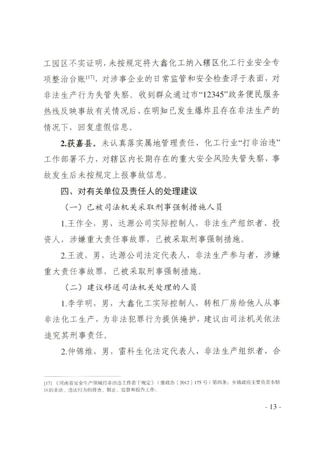 2.仲锦维,雷科生化(达源公司合作公司)法定代表人,非法生产组织者,合伙人,建议由司法机关依法追究其刑事责任。