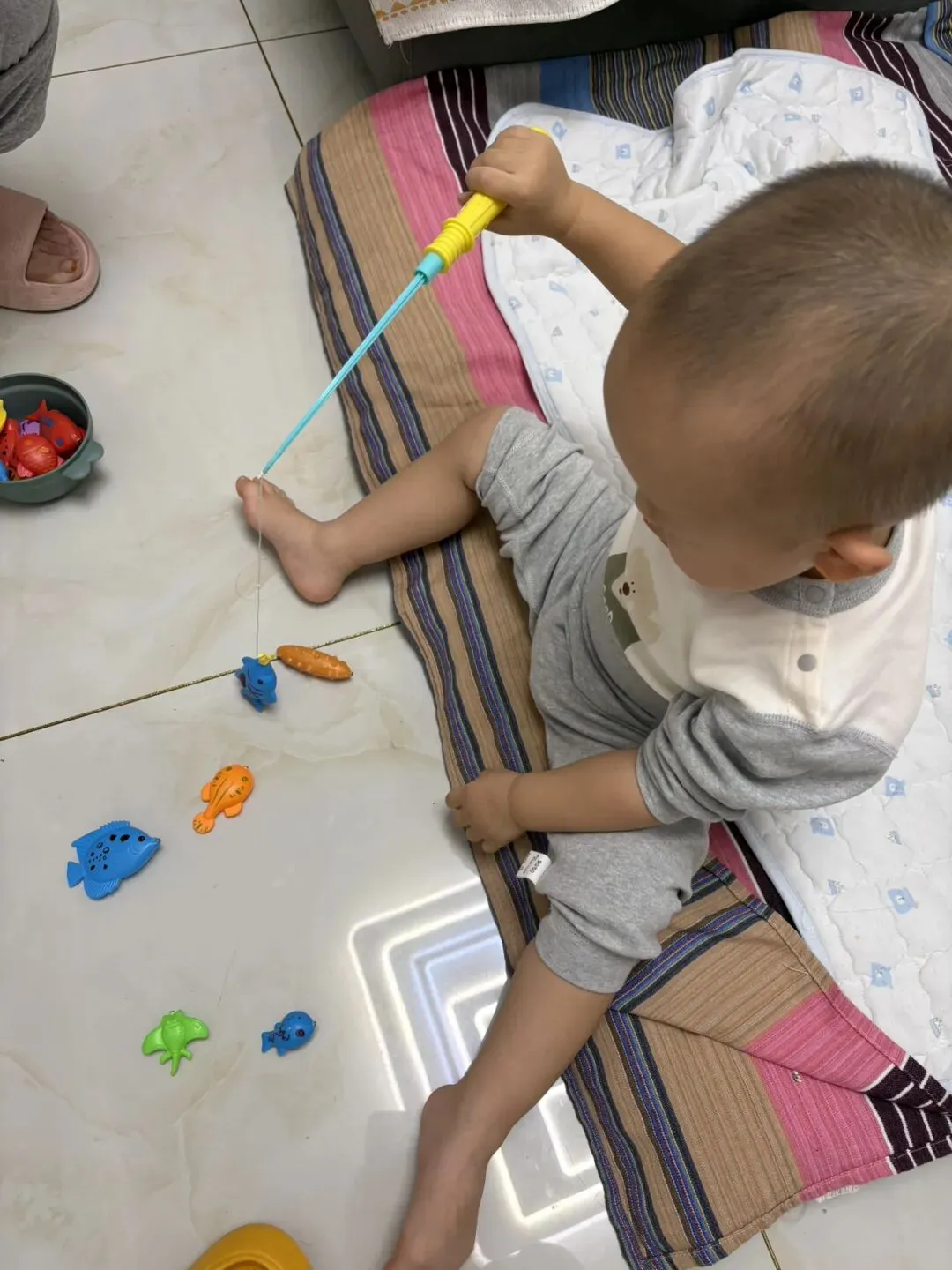 佑儿今天在家玩钓鱼,钓得有模有样的。