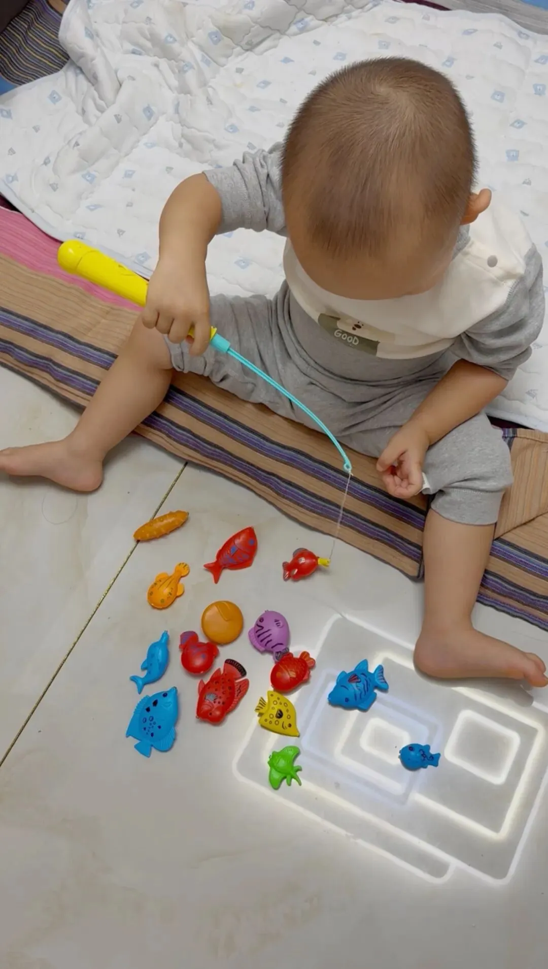 还记得这套玩具刚买回来时,他只是好奇地抓着小鱼扔来扔去。没想到才没过多久,他竟已经能自己握着钓竿,不急不缓地瞄准、尝试,最后稳稳地把小鱼一条条吸了起来。