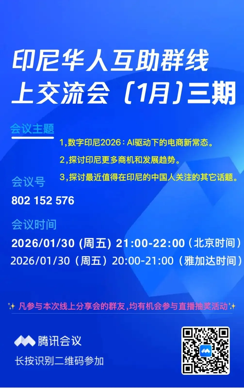 印尼华人互助团,定期结合印尼的时政状况,社会现状,举行在线交流会,通过腾讯会议的方式,每一次交流会的成效都不错,大家反馈良好。欢迎有兴趣的同胞加入印尼华人互助群。凡是参与线上交流会的伙伴,都有机会参与直播抽奖活动。