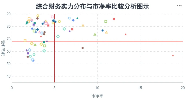在公司的发展能力、经营稳定性及增长潜力的基础上,结合公司主营业务所属行业的分析、资产结构或资产质量分析、主营业务运营效率分析、受评主体的行业地位分析以及偿付能力的分析做出的公司综合财务实力分析判断。分数越高,公司的综合财务实力越强。处在右下区域的公司,市净率较高且相关指数较低,则存在公司综合财务实力不足的潜在风险。