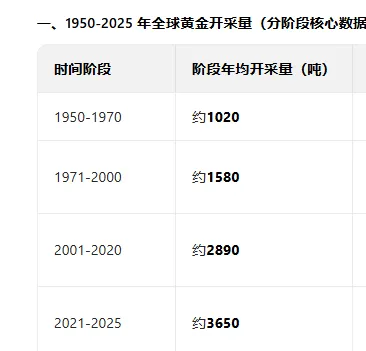 黄金供应增长极其缓慢:年增长率仅约 1.7%(2025 年矿产量 3,672 吨 ÷ 地上存量 21.6 万吨),远低于全球 GDP 和货币供应量增速。