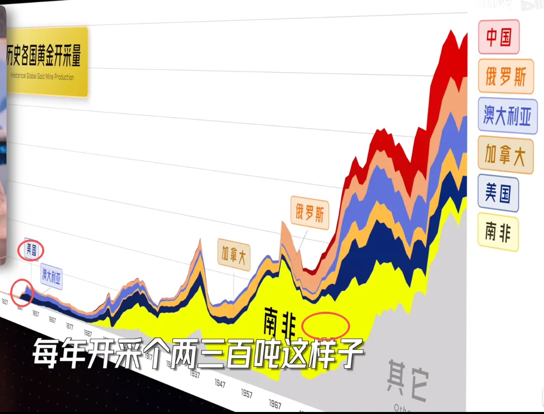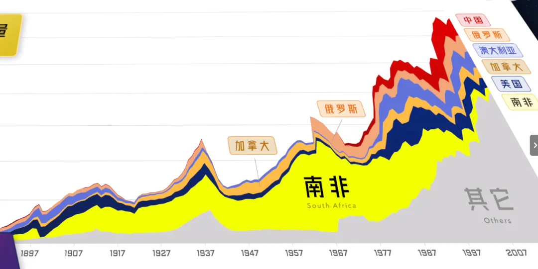 南非的黄金产业核心盛产期为1886 年兰德金矿发现后至 20 世纪 80 年代,其中20 世纪初到 1970-1980 年代是其黄金产量的全球绝对霸主阶段,巅峰时期产量占全球 70% 以上,最高达 80%,被誉为 “世界黄金之都”,这一地位持续超百年,直至 1990 年代后逐步衰落。