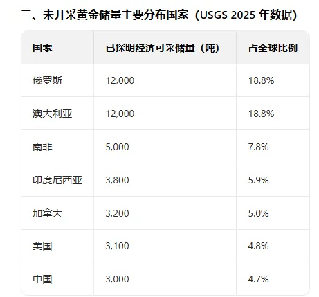 ·人类可获取黄金总量(已开采 + 已探明):约27.5-28.2 万吨