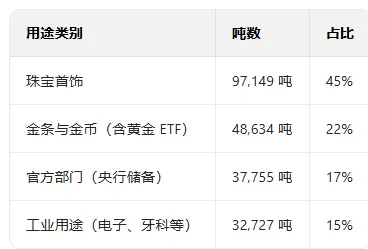地上黄金的用途分布(截至 2024 年底):