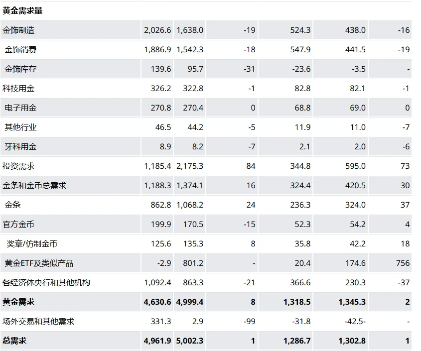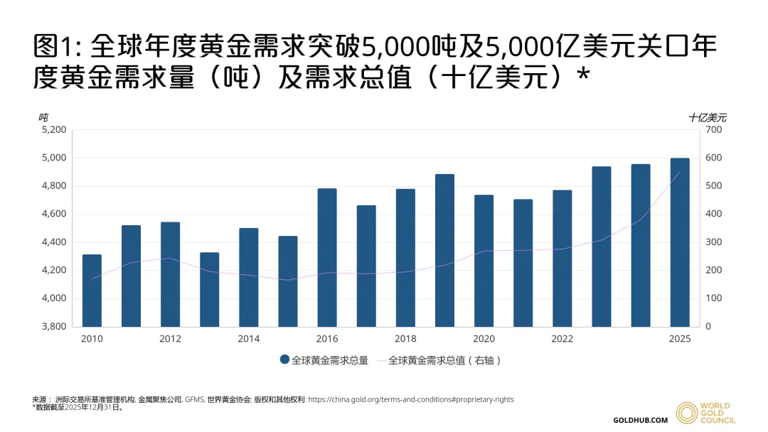 2025年全球黄金总需求达5002吨,约5550亿美元。