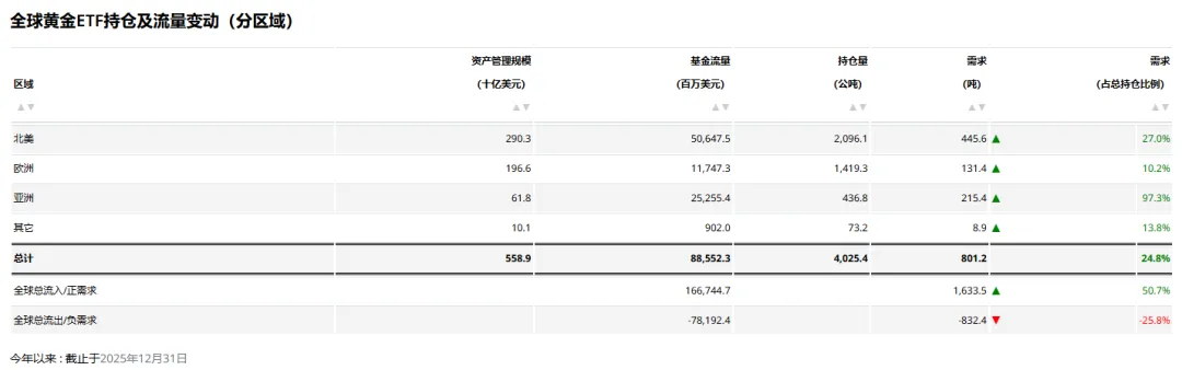 全球黄金ETF全年净增801吨。