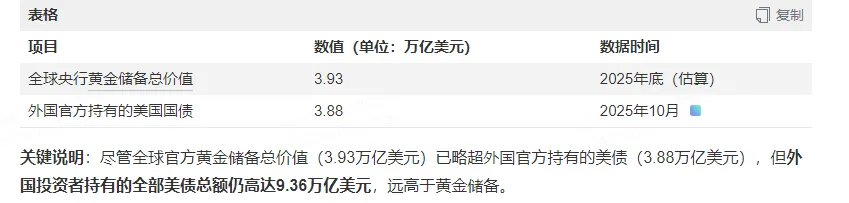 据世界黄金协会(WGC)最新数据,若假设年底央行持有的黄金储备规模不变,以年底价格计算,美国海外全球官方黄金储备价值已达3.93万亿美元。这一数字正式超越了海外官方持有的长期和短期美债规模,后者截至10月份的价值接近3.88万亿美元。