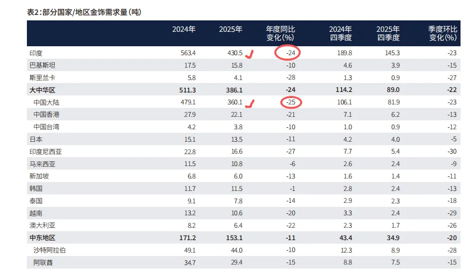 (3)全球金饰消费总量较2024年同比-18%,至1542吨,但全球金饰消费金额却同比增长18%至1,720亿美元的历史高点。