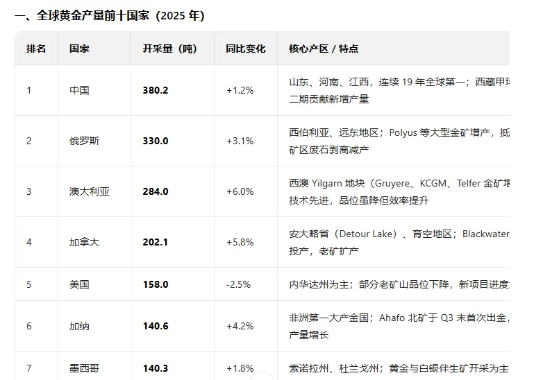 “中国已连续18年保持全球第一产金国地位,这一纪录在‘十四五’期间从未动摇。”产量远超第二名俄罗斯(约 324 吨)和第三名澳大利亚(约 289 吨)。